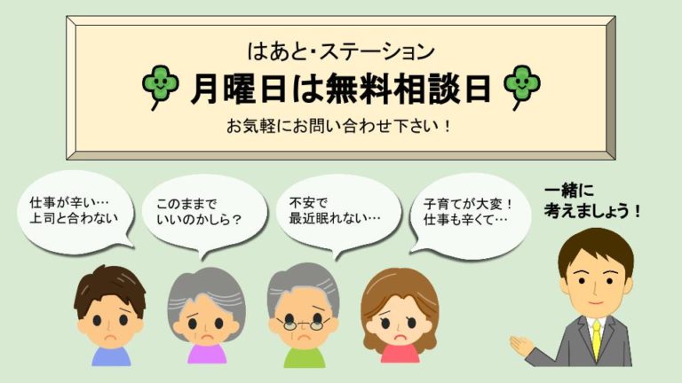 はあと・ステーションでは、熊本で22年の実績を持つ心理カウンセラーが、あなたを親身になってサポートします。 月曜日は無料相談を受付中! うつ等の心身の健康、仕事・育児・離婚・介護のお悩み、人間関係や金銭の問題など、何でもお気軽にご相談ください!